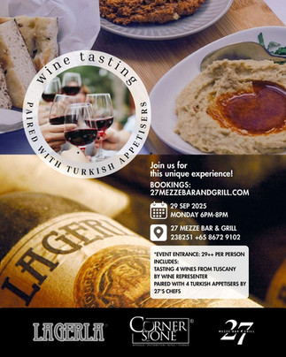 Join us for a delightful wine tasting event at 27 Mezze Bar & Grill, featuring exquisite Italian wines from Montalcino, Tuscany; perfectly paired with mouthwatering Turkish appetizers.